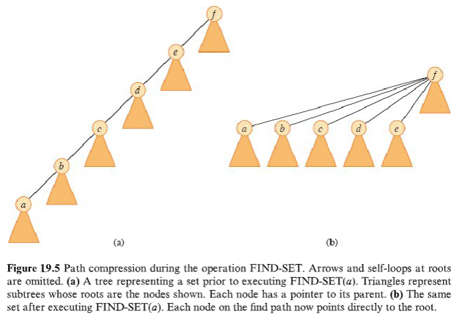 Hvor node som blir besøkt ila FIND-SET blir satt til å peke direkte mot roten. Dette vil ikke endre rangen til noen av nodene.