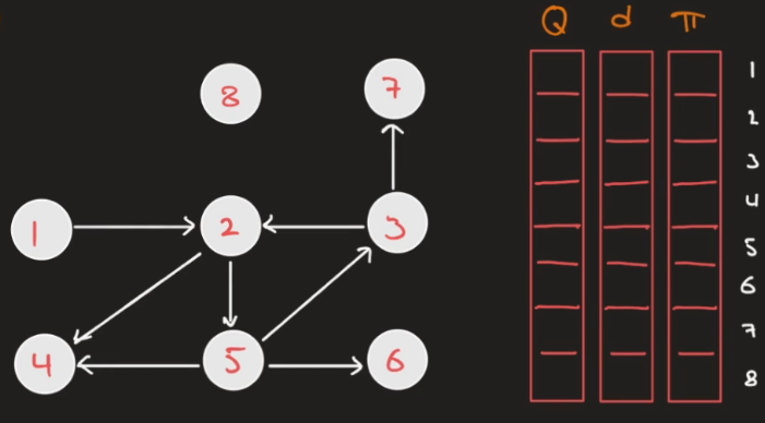 er avstanden fra startnoden til elementet, er køen vår (nest node vi skal se på), og angir hva den forrige noden var. Noder som ikke er koblet, som i eksemplet over, får og .