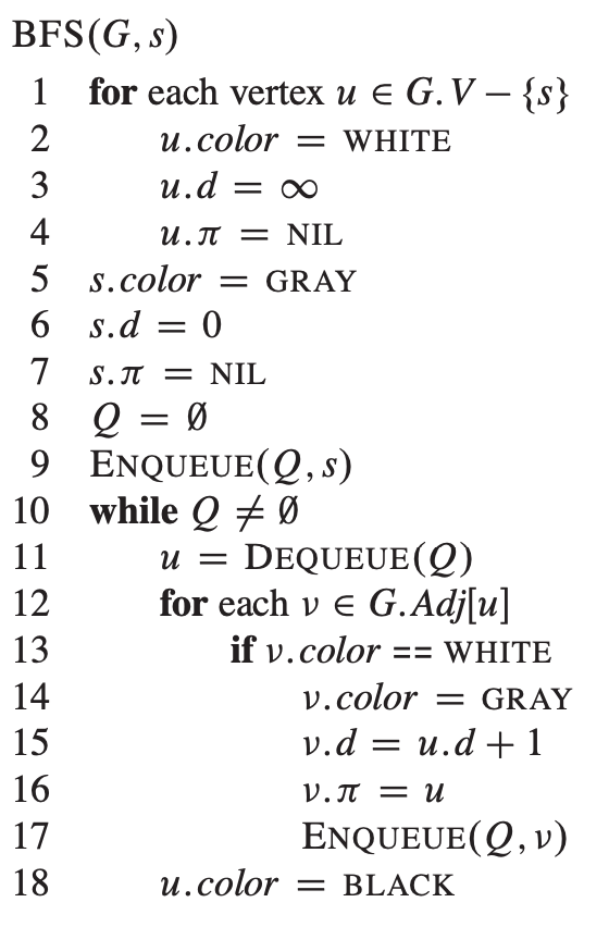 En måte å søke gjennom en graf på, så lenge vi har en graf og en kilde . Leter etter noder som er nærmest først. Altså vi besøker noder som er 2 kanter unna før vi besøker noder som er 3 kanter unna. Køen den bruker er en FIFO