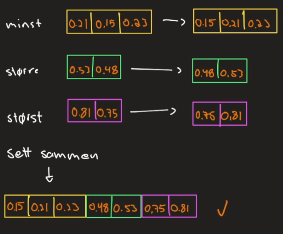 Deler i mindre lister med elementer av ish samme størrelse og sorterer hver delinstans. Deretter legger alle sammen i riktig rekkefølge