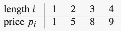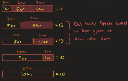 Eksempel: Vi er gitt tabellen under og . Da har vi mulige oppkuttinger. Vi må finne ut hvilken av disse 8 mulighetene som gir maksimal pris. Den naive løsningen (Naiv Algoritme) er å sjekke alle 8 kombinasjoner og sammenligne disse, men da må vi i så fall sjekke eksponentielt mange kombinasjoner - ikke bra! En naiv løsning er presentert i algoritmen Cut-Rod.