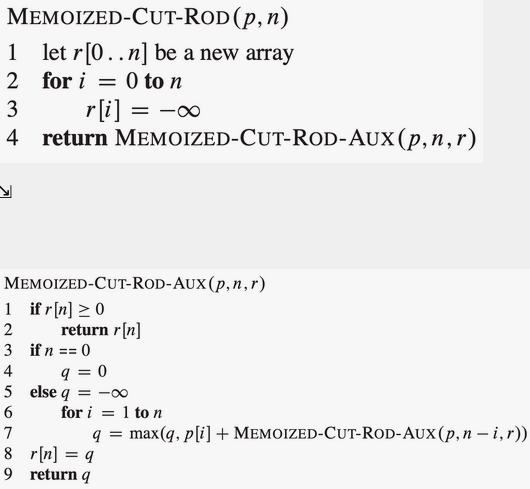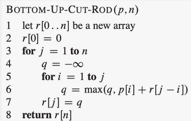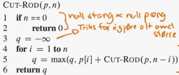 Cut-Rod handler om at du har en stokk med lengde cm og en tabell med priser , hvor angir prisen til en stokk med lengde cm. Vi ønsker å kappe opp denne stokken slik at total pris maksimeres (vi kan kun kappe på hvert heltall antall cm). Det er totalt forskjellige måter å kutte opp en stokk på cm, da vi har indre punkter å kutte på (), og på hver av punktene er valget binært; kutt eller ikke kutt.