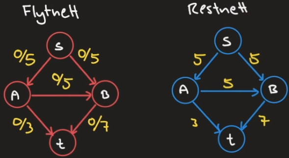 Gitt et flytnett og et Restnett - Residual Network, returnes den maksimale flyten.
