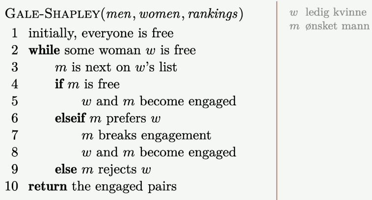 Gitt en Bipartitt graf med menn og kvinner, hvor kvinnene og mennene en har rangering av hvor “desirable” alle av de motsatte kjønn er, finn den beste matchingene. Dersom en mann og kvinne ønsker hverandre mest, men er fanget i andre forhold, skaper de en såkalt “blocking pair”, noe som gjør at den ikke lenger er en Stable matching algorithms.