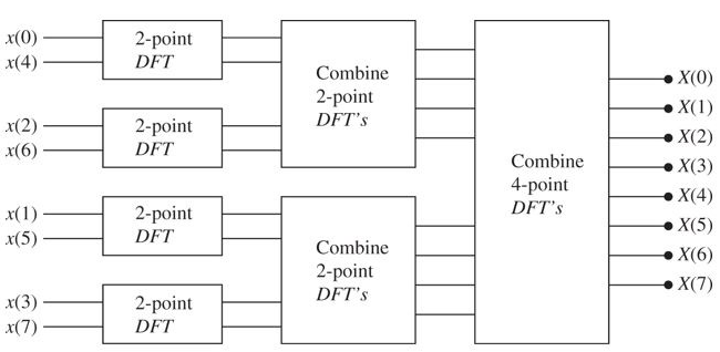 Dividing the DFT - Discrete Fourier Transform problem into smaller successively smaller DFTs, then solving recursively.