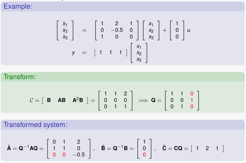 Since the controllability matrix has only two linearly independent vectors, we choose the third one in a way so that the matrix is reversible. The third state remains uncontrollable after the transformation.
