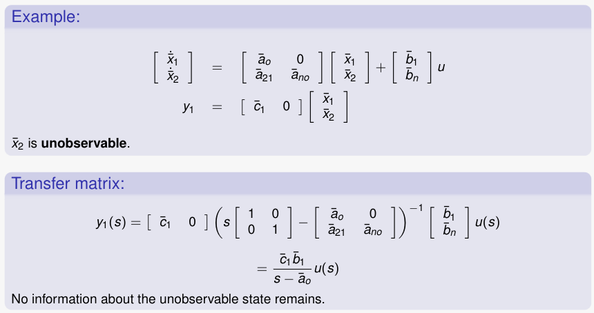 The transfer function does not contain any information about the unobservable and uncontrollable parts of the system. The transfer function is by definition a relation between input and output. Realizations of transfer functions can therefore only produce the controllable and observable subsystem. WE CAN’T MAKE WHAT WE CANT SEE