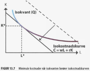 Den stiplede linjen er kostnaden. Ved å senke den til den er nærmest origo, og tangerer isokostnadskurven, kan vi oppnå den beste kombinasjonen av kapital og arbeid.
