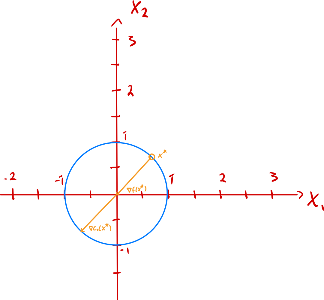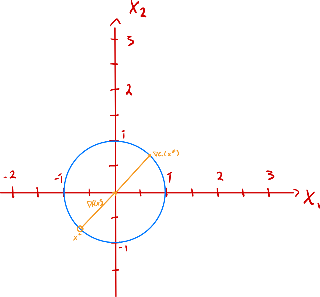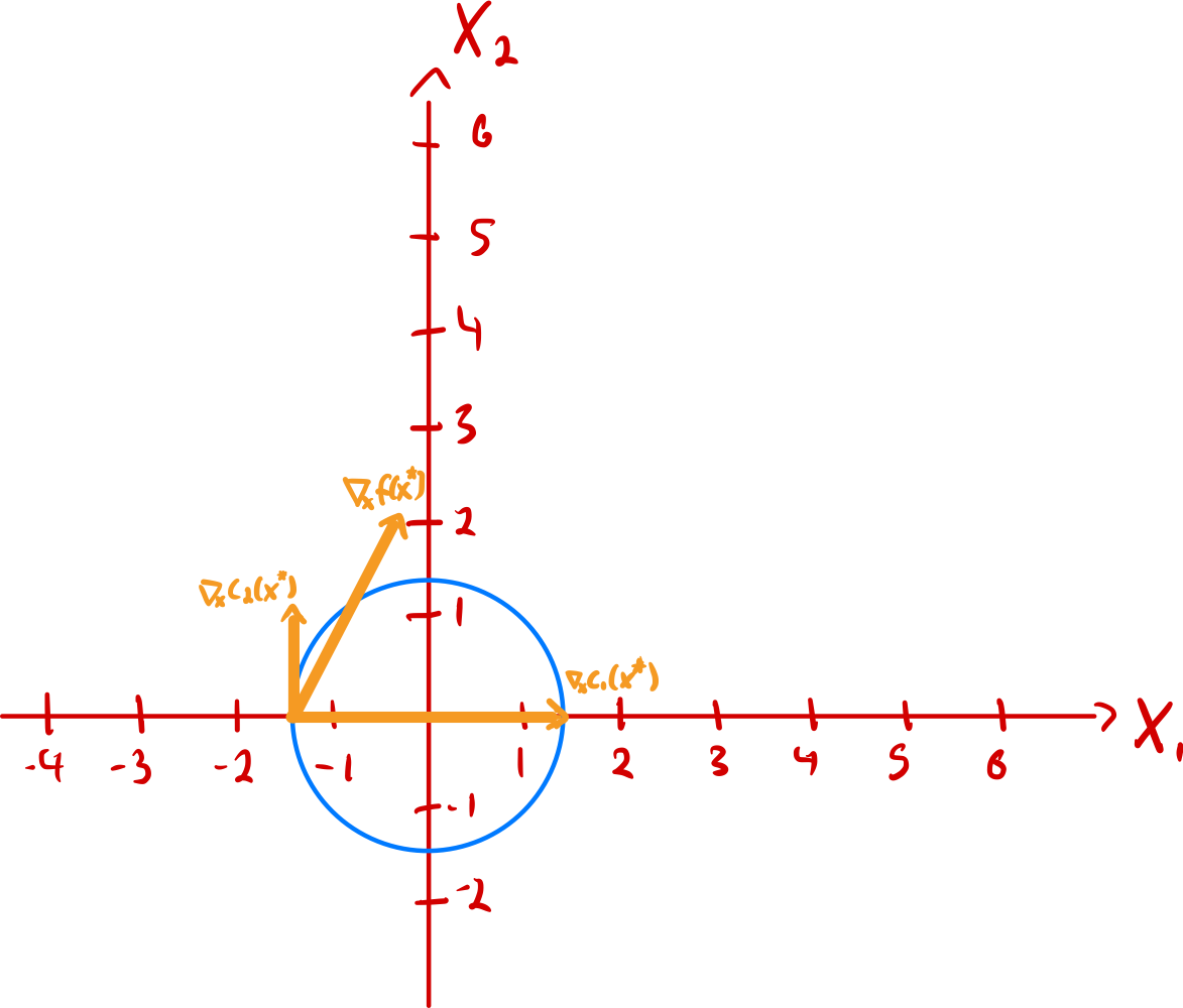 Link to originalSince we have two inequality constraint, where both are active, and no equality constraints we get . We get the following set of equations for finding
