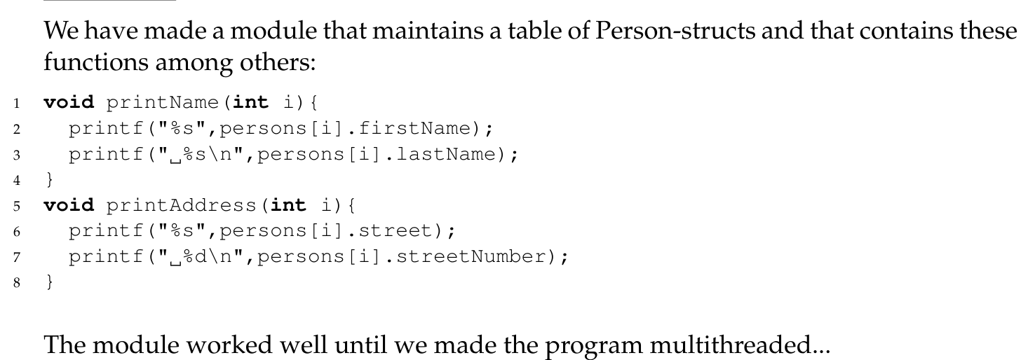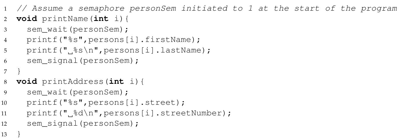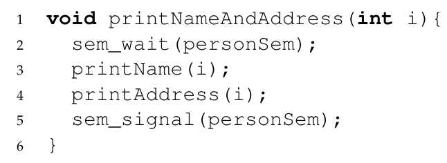 In this situation it might be an alternative to drop the semaphore protection of printNameAndAddress? Why would/wouldn’t this be ok?