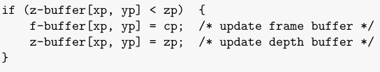 A Hidden Surface Elimination algorithm which ignores transparency. It uses a color buffer, and a depth buffer. Each new primitive is checked against the current z buffer, and if it is closer (smaller), then the depth buffer is updated, and the color is also updated. The code below is the core of the algorithm.