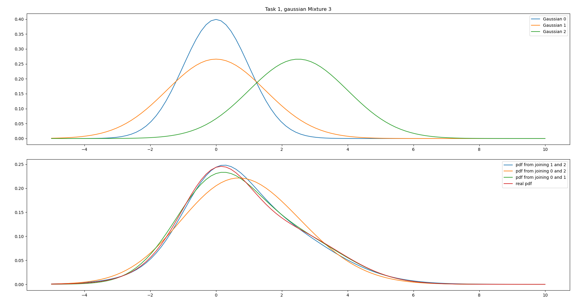 We can see from the parameters that the weights of Gaussian 0 and 2 are very small, and it might therefore be a good decision to combine these (even though the means are far apart)